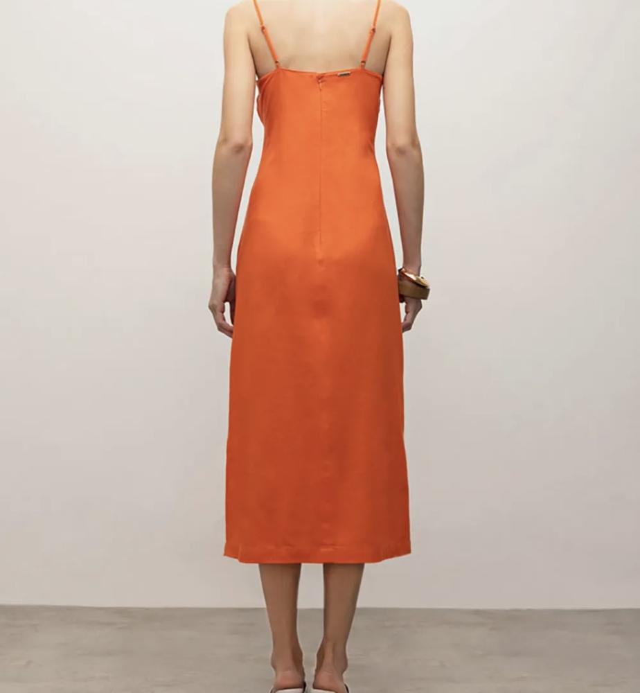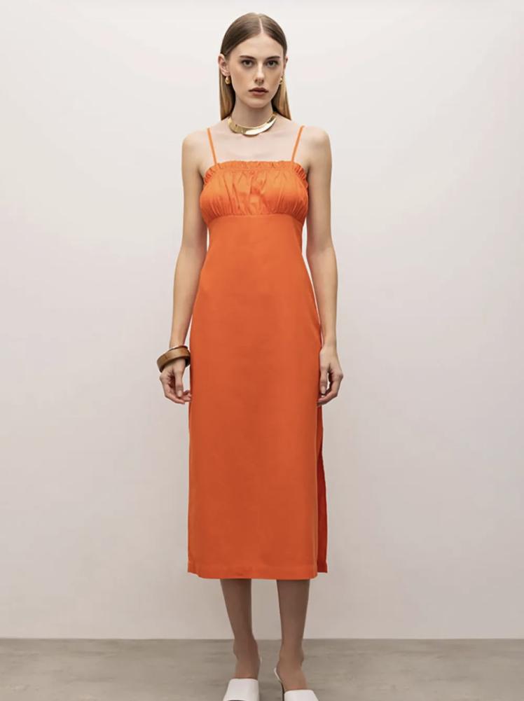 VESTIDO IÓDICE MIDI DECOTE RETO COM FRANZIDO LARANJA